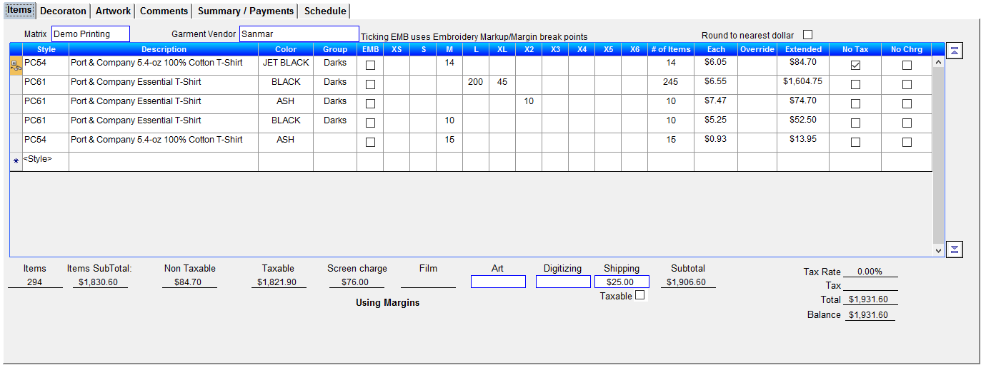 You can now start entering the amount of garments. You can enter quatities for XS to XL on the same line but sizes X2 to X6 must be entered on separate lines.