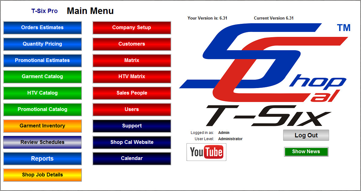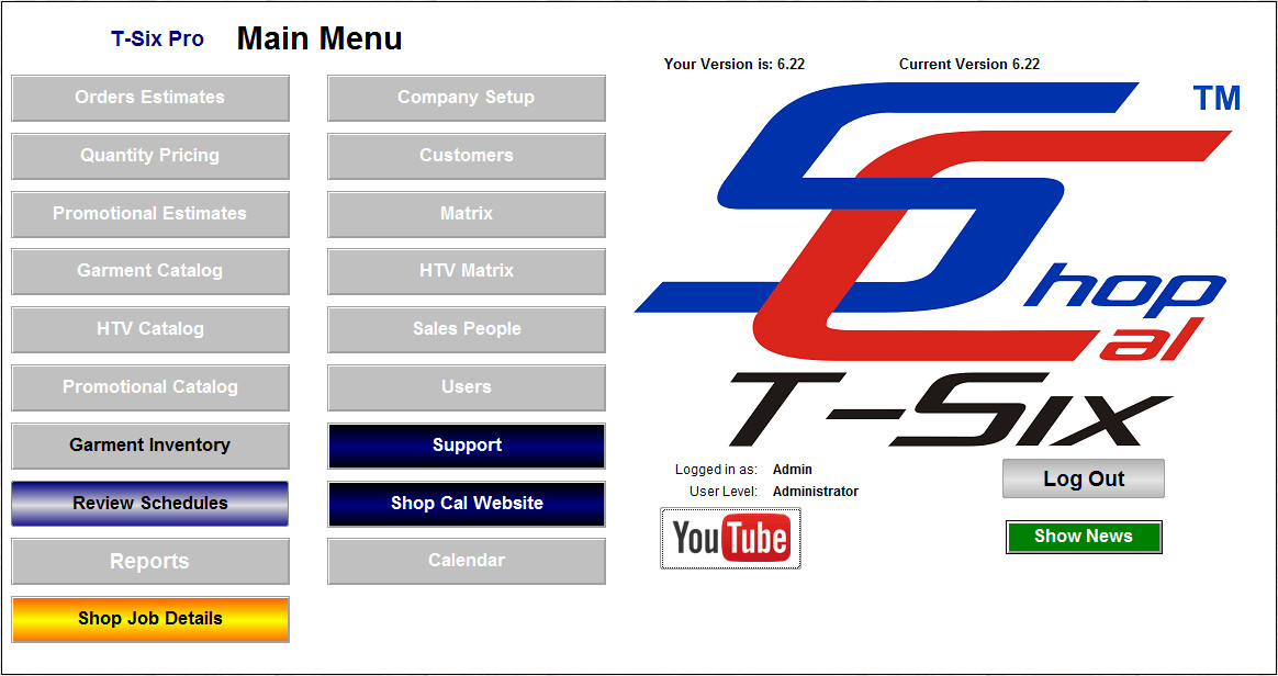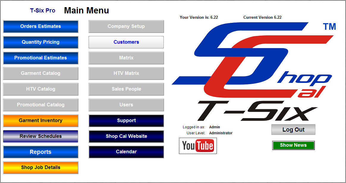 Main Menu for Shop Manager, Shop & Art Department Level