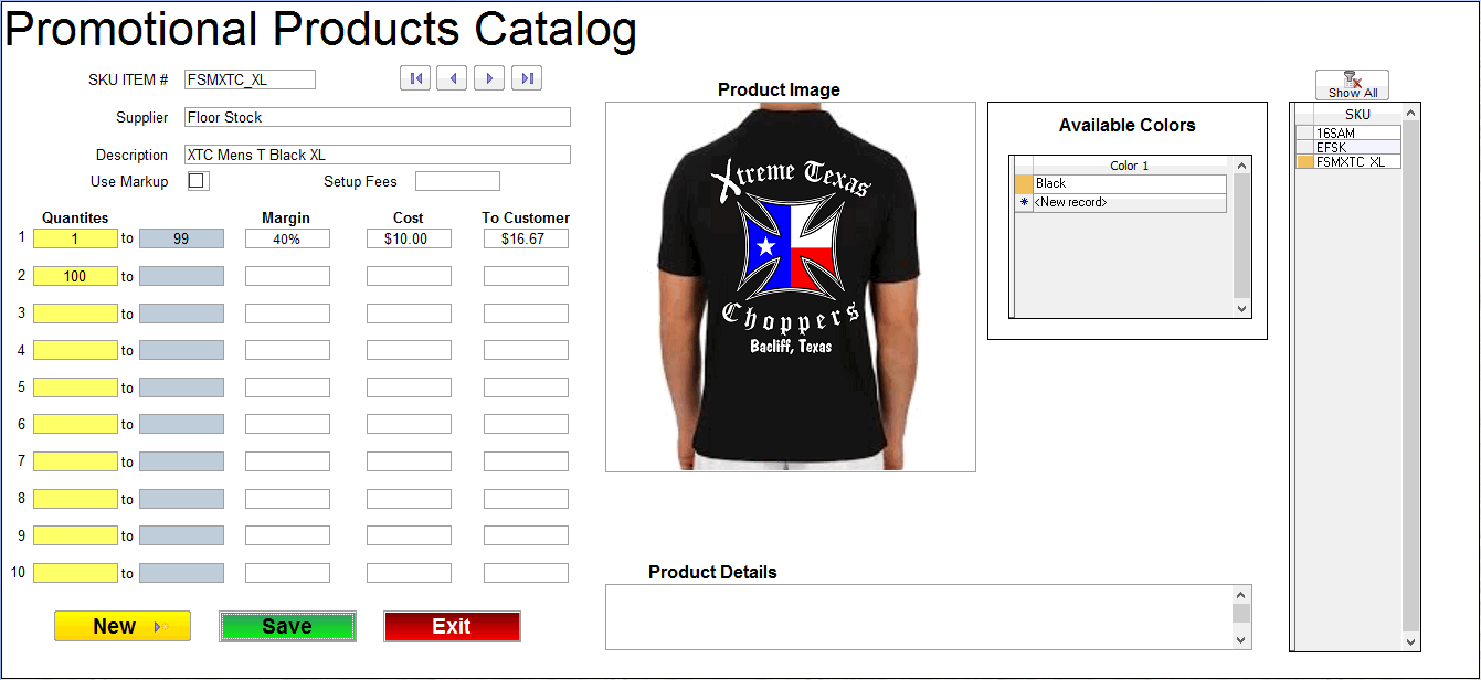 Enter your cost from your promo product supplier and T-Six will calculate the price to customer for each quantity break level.