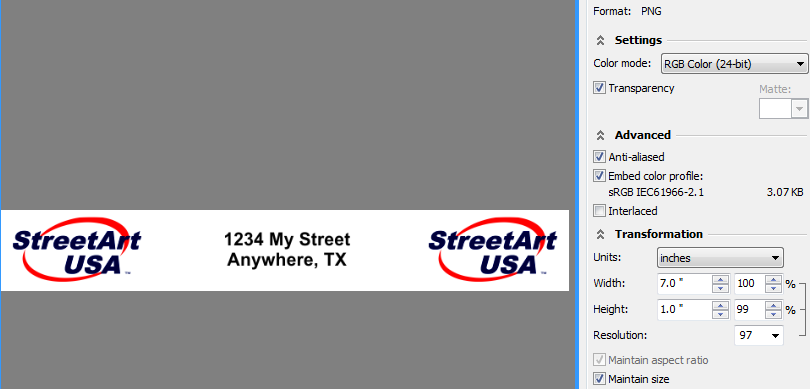 Export the file out as a PNG file named "Company.png". Make sure you have checked "Maintain Size"